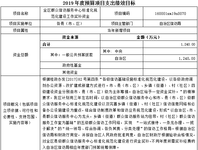 2019年本部门除公用经费、人员经费、“三公”经费等以外的所有预算额度在200万元以上(含200万元)部门预算项目共1个:全区群众信访服务中心标准化规范化建设工作奖补资金,为补助市县项目,经费预算1240万元。